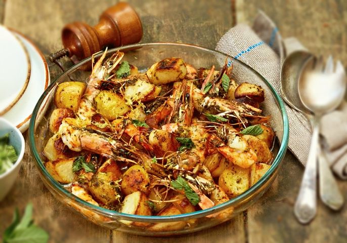 - Put shrimps on baked potatoes. Pour in the mint-lemon-oil mixture, return to the oven for 5 minutes.