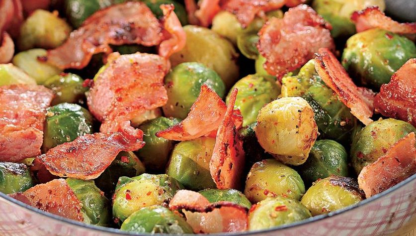 - Cut bacon into thin slices. Heat olive oil in a large skillet over medium-high heat. Add bacon, and sauté for 5 minutes until bacon begins to brown. Add Brussels sprouts, sprinkle with salt and lemon juice and fry it for 2-3 minutes.