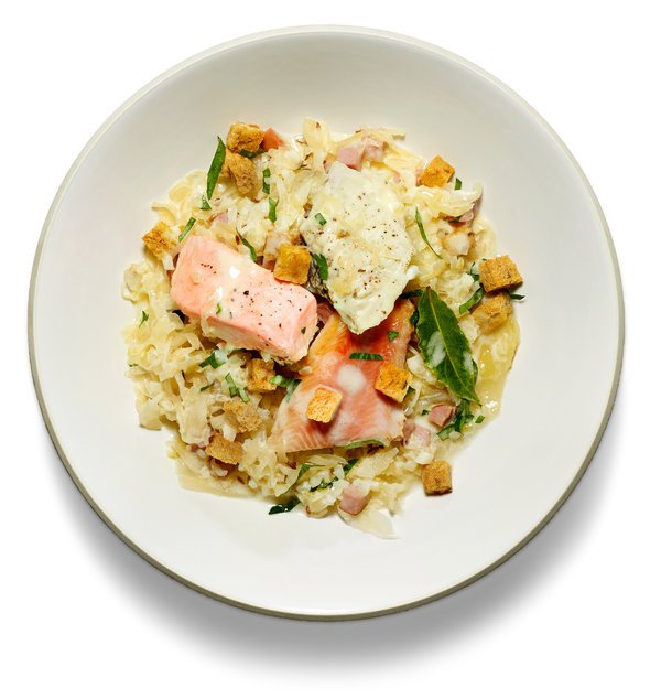 A take on the French classic choucroute garnie (a jumble of fresh meats alongside smoked, served with sauerkraut), made predominantly of fish, but improved with a bit of ham or bacon. The smoked key is the focal point; the salmon adds a beautiful color and delicious richness, with the addition of any white fillet completing this dish. Serve with buttered rye croutons in place of the boiled potatoes it’s traditionally served with, for that added flavor crunch.