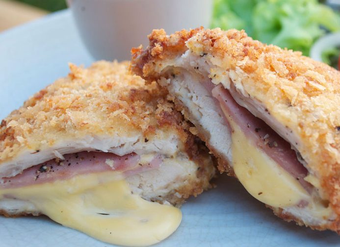 This recipe comes from chef Alexandra Raij who based it on a Spanish dish called flamenquines, a dish where chicken breasts are stuffed with a delicious mix of ham & cheese before being rolled up, egg coated, bread crumbed and fried. Her recipe mostly sticks to this lead, but rather than pounding the chicken breasts & rolling them with the stuffing, thin cutlets of chicken are used and the stuffing is layered between them, sealed together with an egg mixture. The chicken is then fried to a delicious golden hue, making this dish both crunchy and greaseless. The crumbs help to protect the delicate meat from overcooking.
