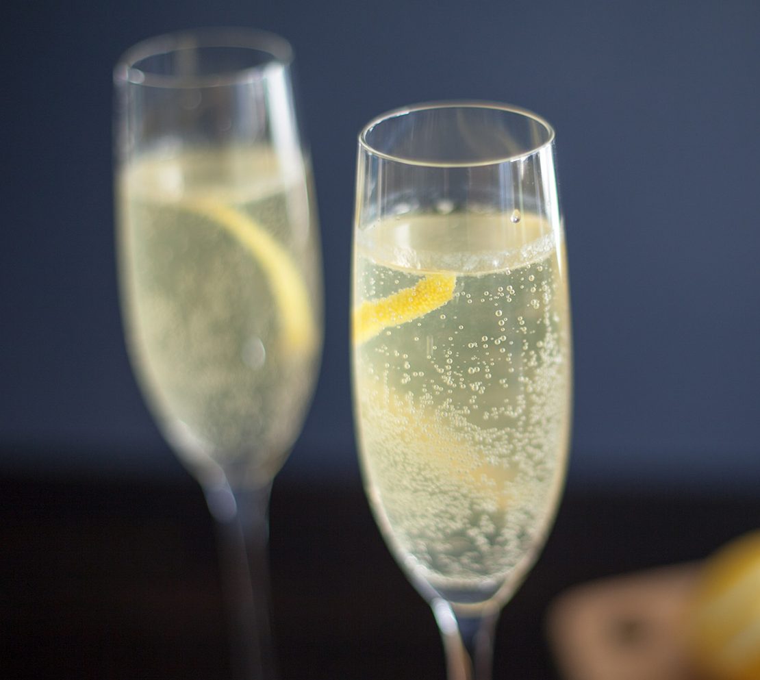 - Strain into a chilled cocktail coupe or flute and top with Champagne. Finally, use a lemon twist as garnish and enjoy!