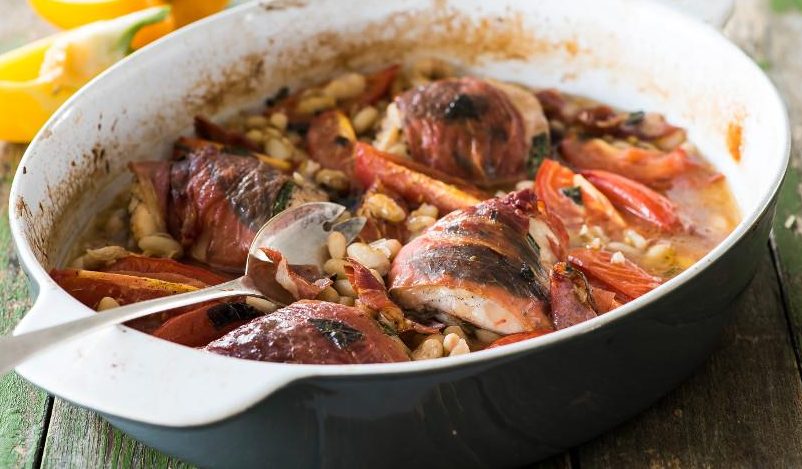 1.Rub the chicken pieces with salt and pepper mixture. Place 2-3 basil leaves on each and wrap with a slice of ham. Place chicken in an ovenproof dish with heated olive oil. Fry it for 3-4 minutes from each side.