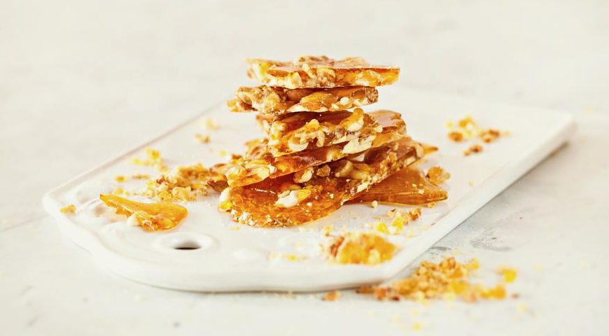- Cover the working surface with a sheet of foil or pastry paper, oil it and pour the caramel mixture. Smooth out the surface with a spoon. Let it freeze. Separate the praline from the foil and serve.