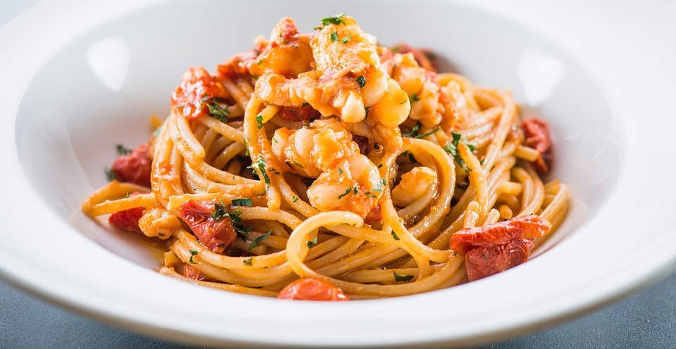 - After turning the heat down to medium, the hot pepper flakes & garlic. Cook whilst stirring, until fragrant, )some 10-20 seconds due to the quite hot pan), and then stir in the tomatos + liquid, salt, sugar, and oregano (or thyme). Adjust the heat to med-high, and stir frequently until the tomatoes reach a brisk boil. Turn heat back down to medium & cook whilst stirring, until the tomatoes have cooked down (roughly 10 minutes). Add in the kale, stir, and simmer for an additional 3-5 minutes. Next, add the shrimp (or keep for last minute plating, as desired), take off the heat, and keep warm. If you find the sauce drying, add a little cooking water reserved from the pasta.