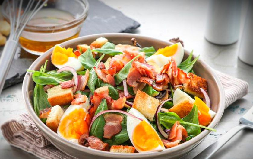 10. Spread eggs and croutons on spinach. Sprinkle with fried bacon. Serve warm.