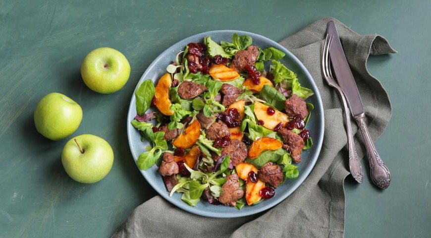 This warm salad with chicken liver and apples is a real culinary masterpiece, combining a whole bunch of flavors, aromas and textures! This dish is also quite satisfying, but light at the same time.
