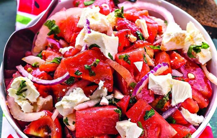 • Watermelon Salad with Peppers, Tomatoes and Cheese